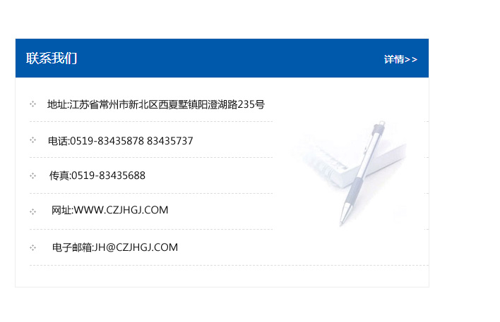 地址:常州市新北區友邦商務大廈1幢16、17層  電話:0519-85101652  傳真:0519-85112595  郵編:213022  網址:www.cz-jiayue_cn.mlicz.com  郵箱:xiajifengaa@163.com